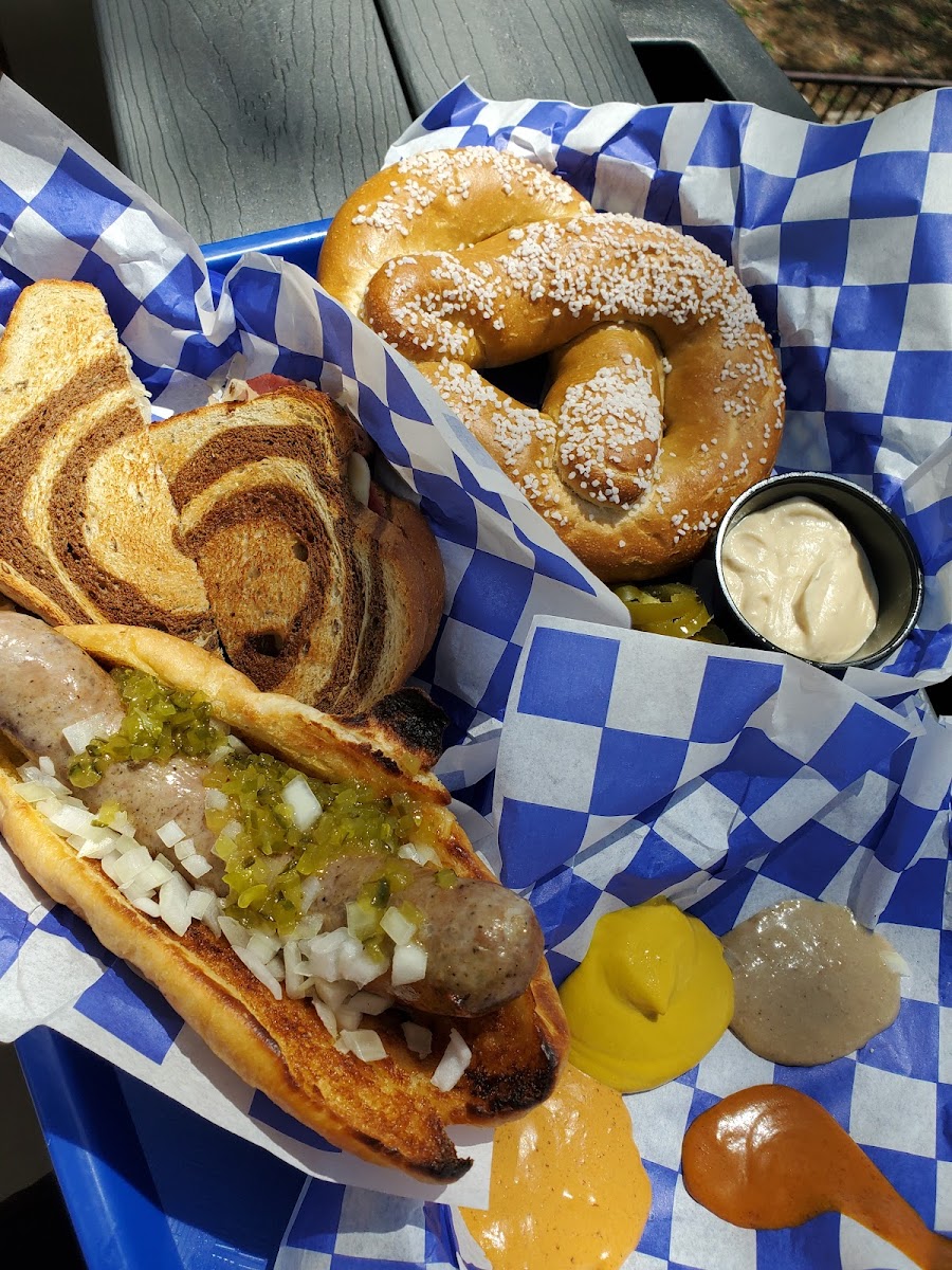 Great place to visit with friendly dogs and kids. Huge fenced area around the building. Delicious beers, liquors available. The sausages are so tasty and cooked to perfection. Lots of sauce choices, although I didn't care for any of them. I do wish they would let you purchase just the sausage without a side or if you buy one add a second.