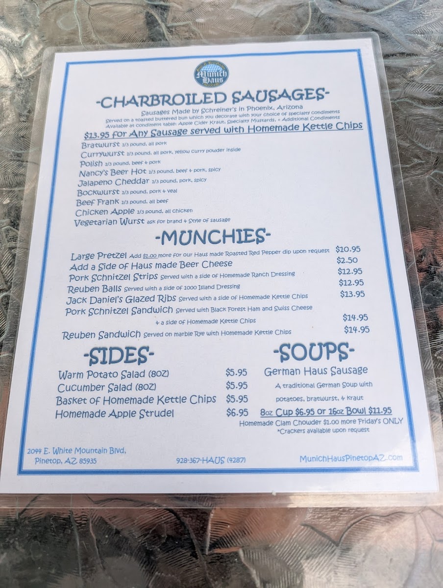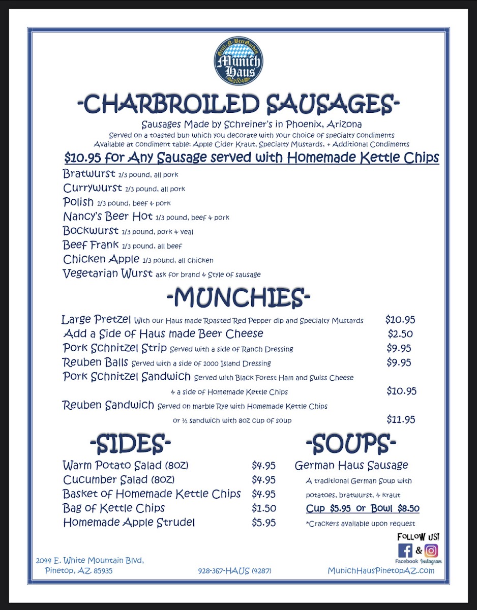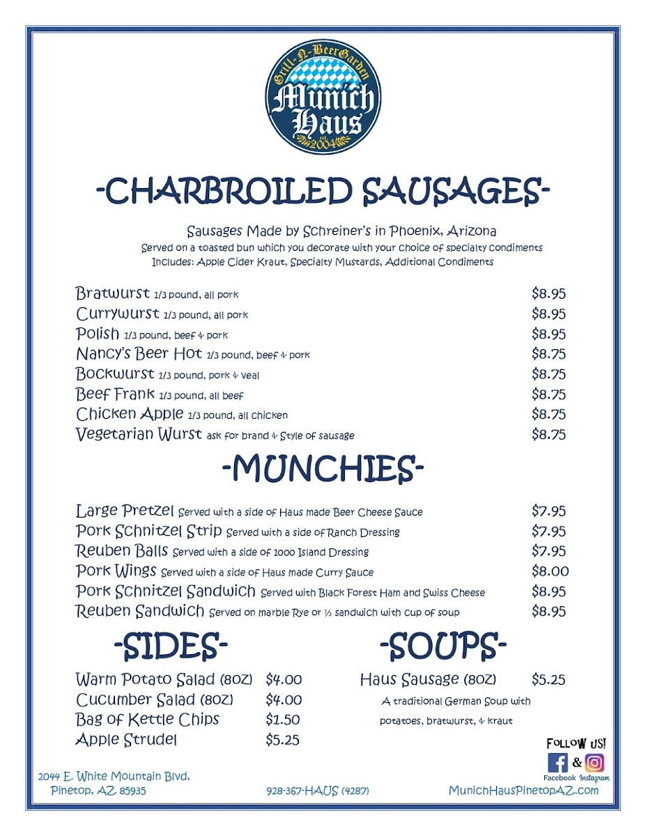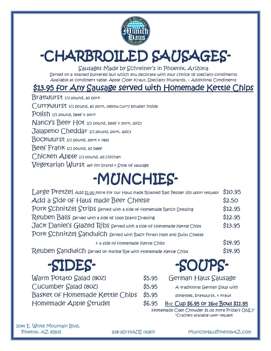 Welcome to Munich Haus Grill-N-Beergarden, a culinary gem nestled in Pinetop, AZ. This vibrant eatery expertly showcases traditional German flavors, highlighted by charbroiled sausages made by Schreiner’s in Phoenix. Indulge in a perfect Bratwurst or zest up your palate with the Currywurst, both served on toasted buns, waiting for you to adorn them with specialty condiments.